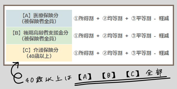 年間の保険料 = 【A】医療保険分 + 【B】後期高齢者支援金分 + 【C】介護保険分 ( – 軽減)